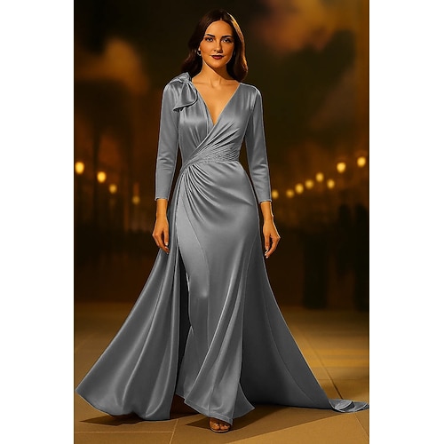 Linea ad A Lunghezza al pavimento Abito da Sera Da principessa Abito formale Elegante Setoso Manica 3/4 Scollo a V Ospite di nozze Cocktail party Raso con Spacco