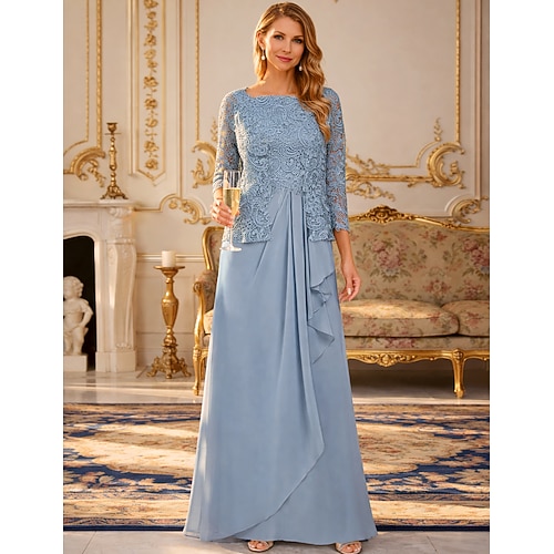 Linea ad A Lunghezza alla caviglia Vestito da Festa Abito da Cocktail Abito da invitata a nozze Abito da cerimonia per signora Manica 3/4 Collo gioiello Elegante Ospite di nozze Chiffon Pizzo con