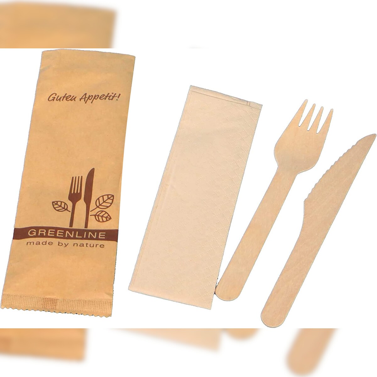 250x Bio Besteckset Holzgabel+Holzmesser+Serviette 33x33cm 2lg natur in Papierhülle