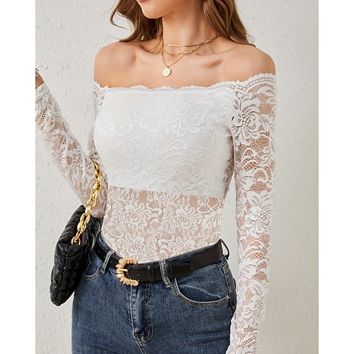 Per donna Blusa Top in pizzo Semplice Elegante Sexy Manica Lunga Senza Spalle Top Regolari Quotidiano Ferie Uscire Pizzo Nero Bianco Vino Estate Primavera