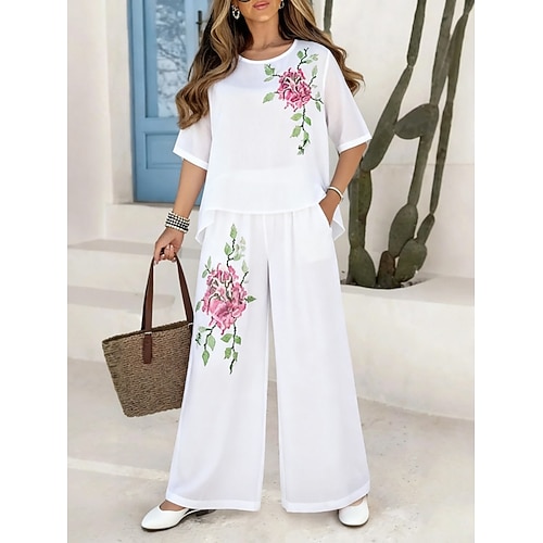 Per donna Set di biancheria in cotone Set di Pantaloni Mezza Manica Girocollo Floreale Elegante Moda Streetwear Casuale Quotidiano All'aperto Nero Bianco Rosa Primavera Estate Vestibilità comoda