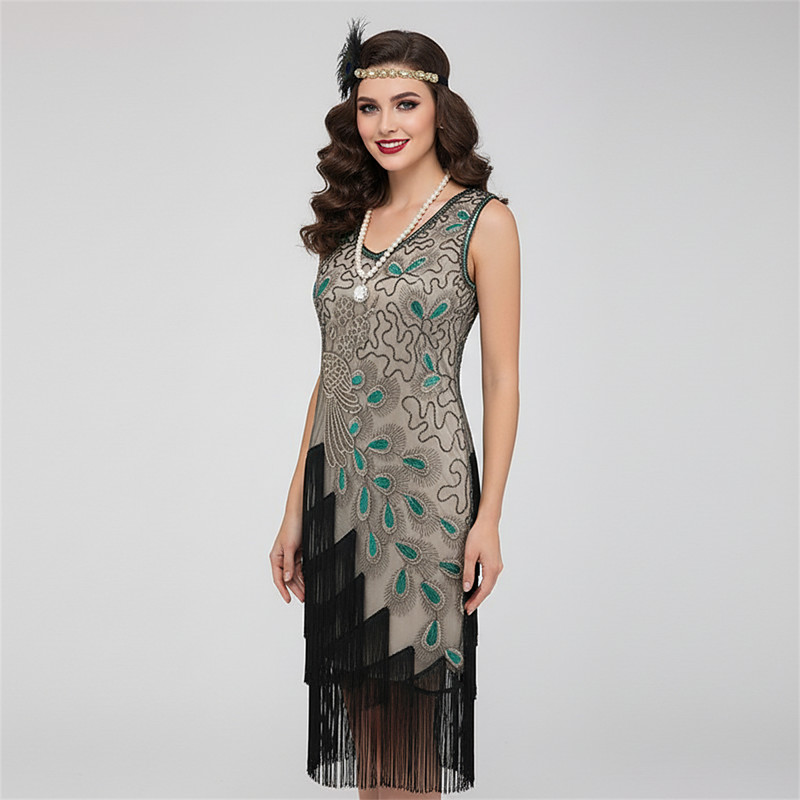 Roaring 20s 1920s Cocktail Dress Knee Length Flapper Dress Dress Outfits Sleeveless The Great Gatsby Charleston Plus Size Tassel Fringe Feather V Neck Fancy Dress Women's Carnival New Year Masquerade