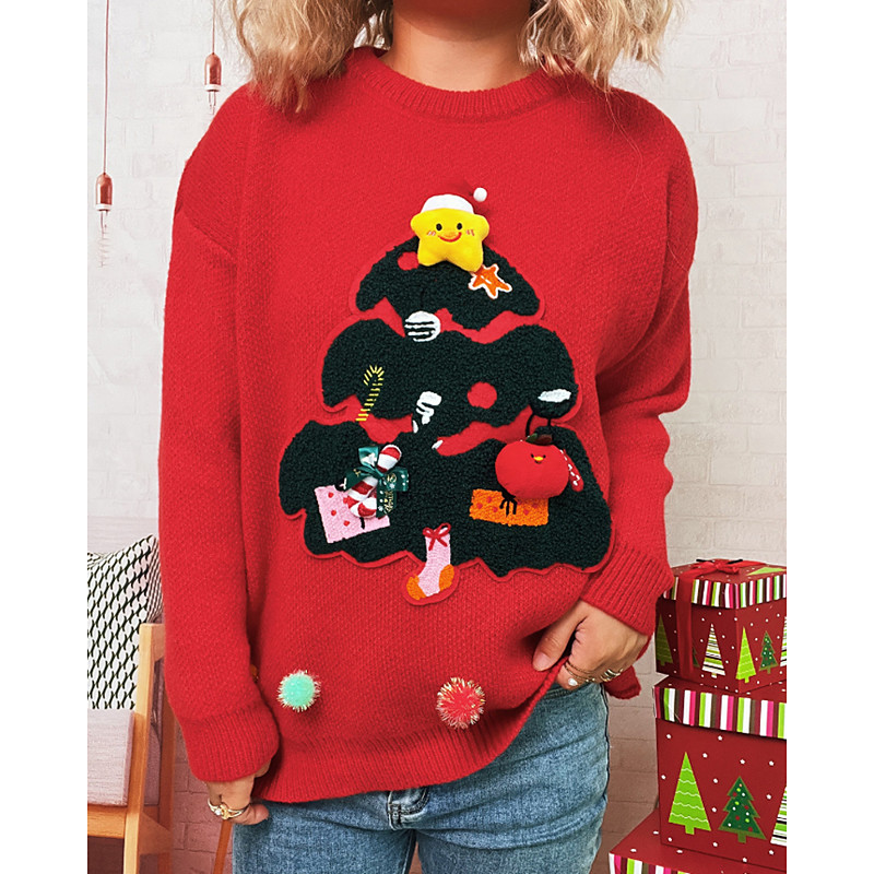 Women's Sweater Pullover Pom Poms Ugly Christmas Gifts Streetwear Floral Crew Neck Knitted Print Long Sleeve Regular Tops Knit Christmas Holiday Going out Black Red Fall Winter