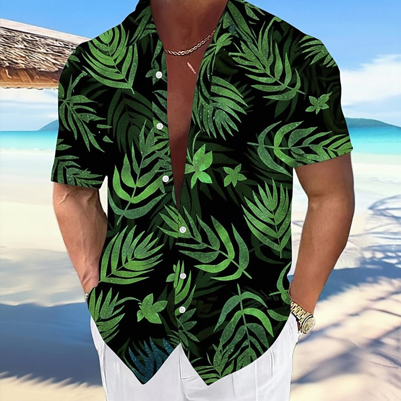 Men's Leaf Tropical Plants Neon Glow Summer Hawaiian Shirt Button Up Shirt Aloha Shirt Short Sleeve Hawaiian Vacation Beach Wear Summer Spring Turndown 3D Print Collared Shirts Blue Purple Green
