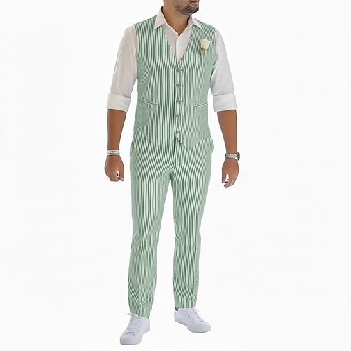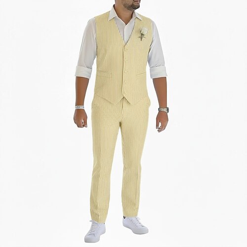 Abiti da sposo da spiaggia per uomo, in seersucker, con scollo a V, gialli, rosa, alla moda, casual, a righe, su misura, 2 pezzi, monopetto, cinque bottoni