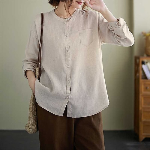 Per donna Camicia Camicia di lino Camicie di cotone e lino Semplice Quotidiano Elegante Essenziale Manica Lunga Senza Spalle Top Regolari Quotidiano Uscire Arricciato Nero Bianco Blu Primavera