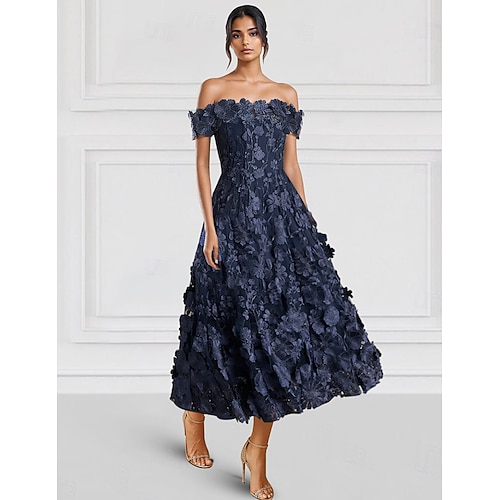 Linea ad A Lunghezza Tè Abiti da Cocktail Abiti da festa Elegante Senza Maniche Senza Spalle Festa in giardino Matrimonio Pizzo con Applicazioni