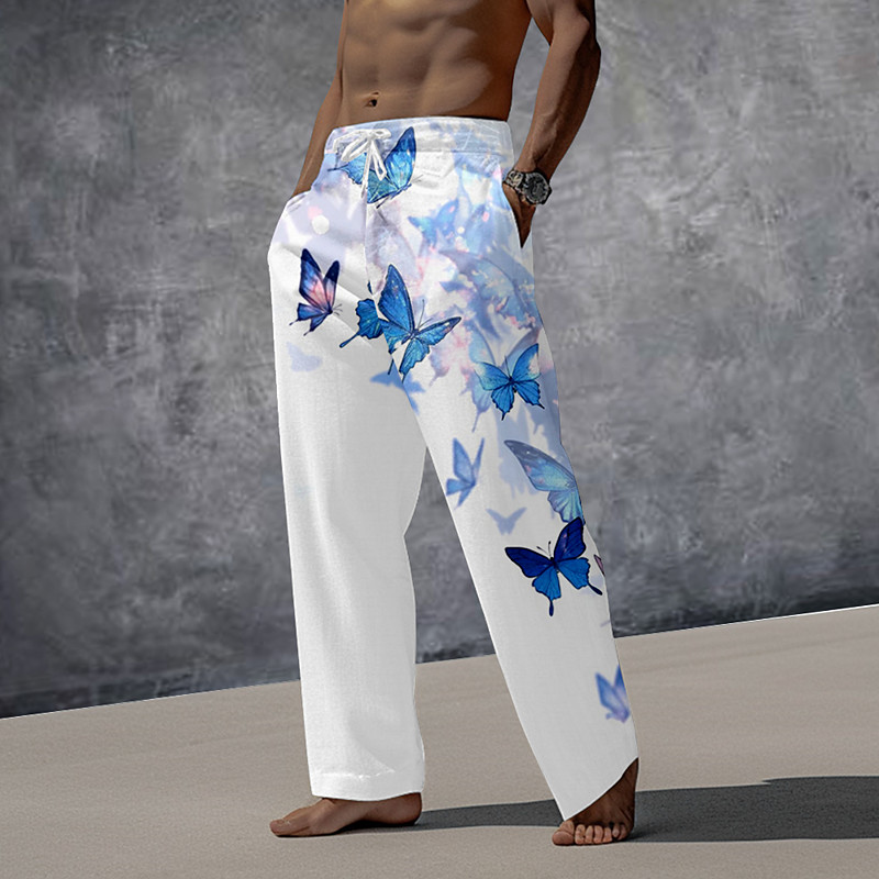 Men's Butterfly Trousers Mid Waist Holiday Casual Summer Spring 3D Print Lake blue Black Royal Blue