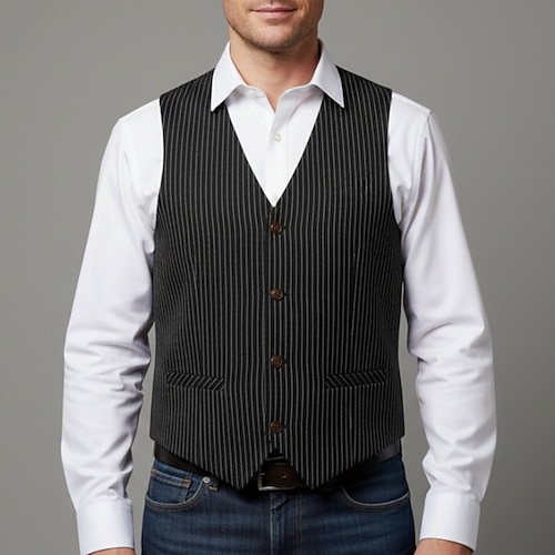 Per uomo Gilet Formale Vacanza Casuale Quotidiano Moda Classico Primavera Autunno Tasca Bottoni Poliestere Confortevole A righe Monopetto Scollo a V Bavero Vestibilità regolare Nero Gilet