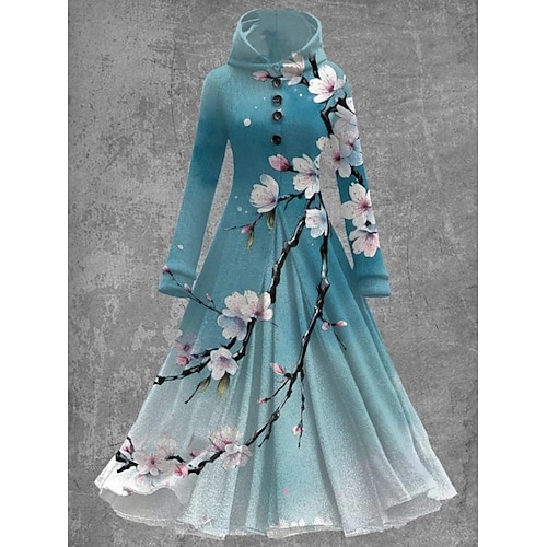 Per donna Abito maxi Abito a trapezio Casual Quotidiano Vestibilità regolare Floreale Manica Lunga Con Cappuccio Blu reale Blu Azzurro cielo Verde Primavera Autunno