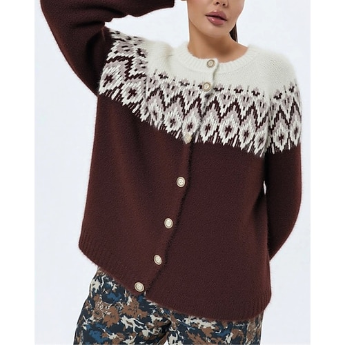 Per donna Maglione natalizio Fair Isle Felpa Maglione Streetwear Casual Geometrico Girocollo Lavorato a maglia Stampato Manica Lunga Top Regolari Maglia Quotidiano Ferie Uscire Rosso Marrone Autunno