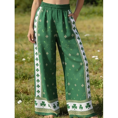 Damen Weites Bein Hosen Hose Palazzo-Hose Urlaub Vintage Basic Volle Länge Hohe TaillePantsSt. Patrick Tag Kleeblatt Bestickt Tasche Elastischer Bund Komfort Atmungsaktivität Bequem Unelastisch