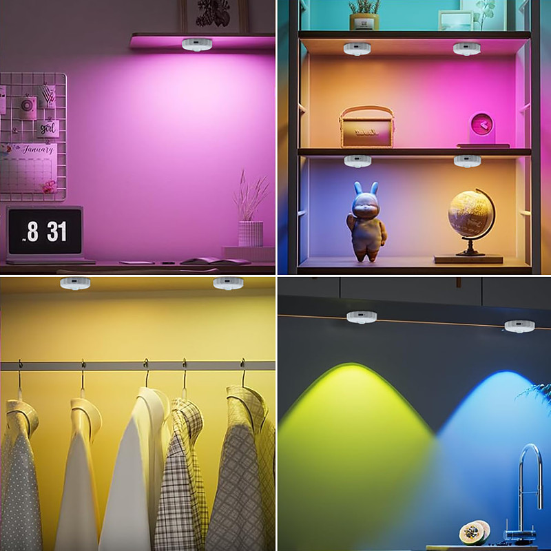 Rechargeable RGB Puck Lights with Remote Control 1200mAh Battery Operated Tap Lights Dimmable Touch Under Cabinet Lighting Wireless Push Lights LED USB Shelf Light