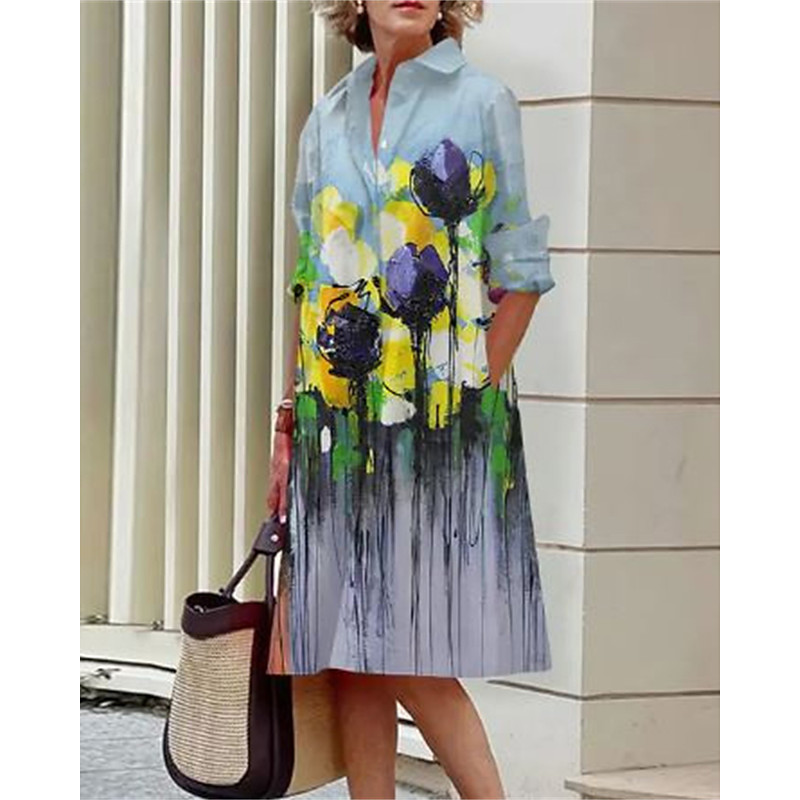 Women's Midi Dress Shirt Dress Casual Dress Fashion Modern Daily Beach Weekend Regular Fit Flower Long Sleeve Shirt Collar Blue Black Orange Green Spring Fall