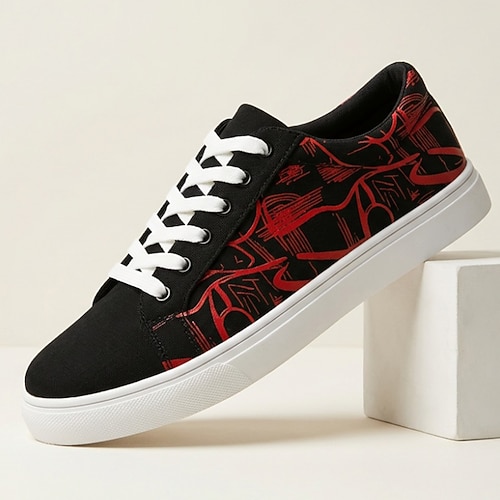 Sneakers casual da uomo nere e rosse con grafica, allacciate, leggere e comode, scarpe da passeggio basse alla moda per l'uso quotidiano, i viaggi, lo streetwear, gli outfit del fine settimana e uno stile casual di tendenza.