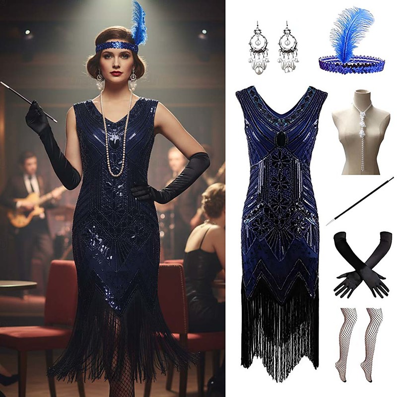 Set Roaring 20s Vintage Inspired The Great Gatsby Knee Length Short Length Flapper Dress Dress Outfits with Accessories Sleeveless The Great Gatsby Wedding Guest Sequins Tassel Fringe Sequin V Neck