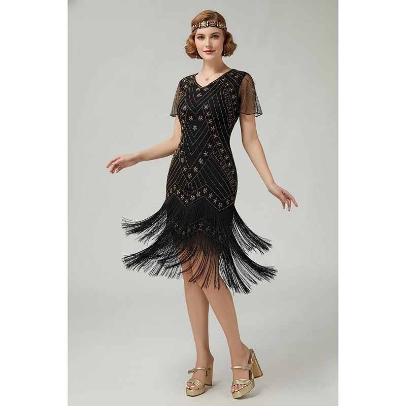 Roaring 20s 1920s Knee Length Flapper Dress Short Sleeves The Great Gatsby Sequins Fringe V Neck Fancy Dress Women's Christmas Carnival Masquerade Retro Theme Party Charleston Dance Adults' Dress