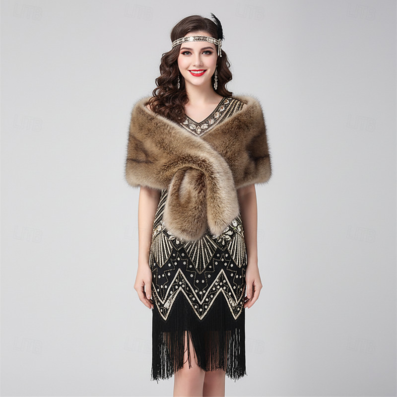 Set Retro Vintage Roaring 20s 1920s Midi Flapper Dress Fancy Costume Faux Fur Shawl with Accessories The Great Gatsby Flapper Girl Sequins Tassel Fringe Fancy Dress Women's New Year Masquerade