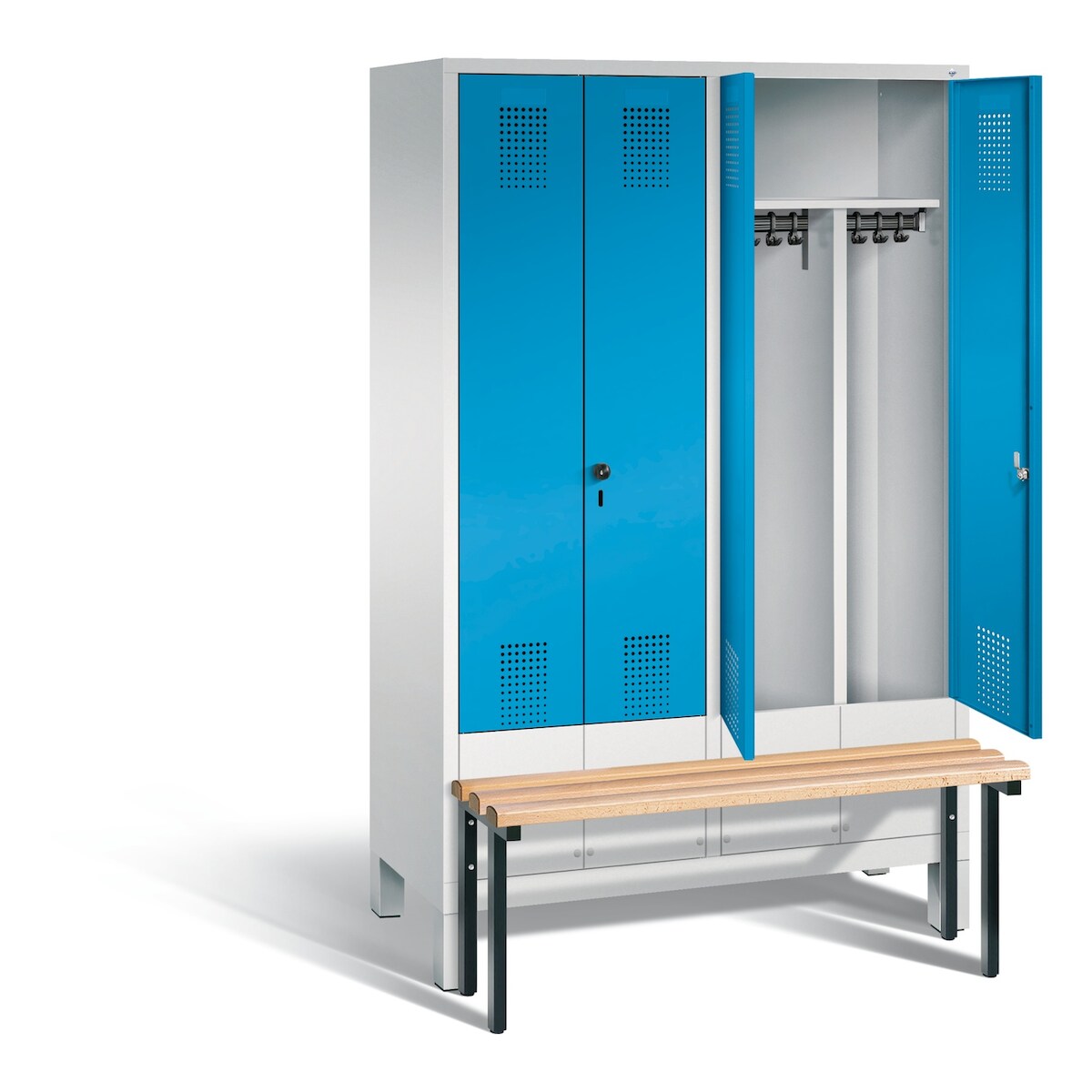 C+P Schwarz-Weiß-Spind Classic PLUS Sitzbank, Trennwand mittig, 1 Abteil, lichtgrau / enzianblau, B 800 mm, Sicherheits-Drehriegel, untergebaut,