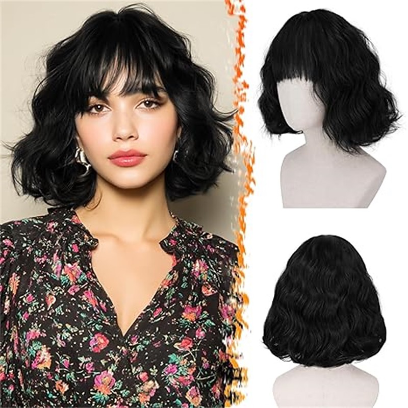 Wig with Bangs for Women Bob Wavy Synthetic Wigs with Natural Shoulder Length Curly Heat Resistant Hair Halloween Cosplay Party Wigs
