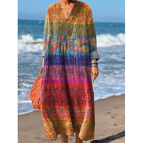 Per donna Abito maxi Vestito Estivo Abito a trapezio Vacanza Casual Boho Feste Ferie Spiaggia Vestibilità comoda Floreale Grafico Geometrico Manica Lunga Scollo a V Giallo Rosso Fucsia Arancione