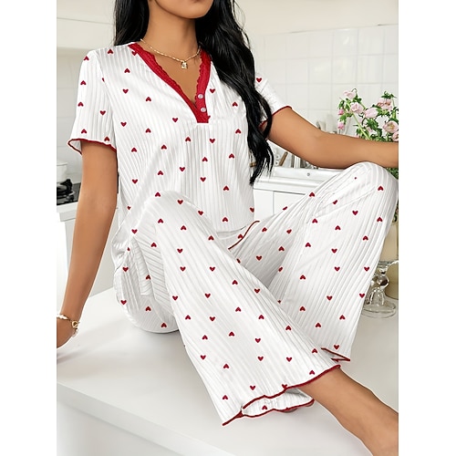 Per donna Set Pigiama Casual Comfort Cuore Elastico in vita Pantalone Quotidiano Casa Manica Corta Scollo a V Bianco Vino Rosso Fucsia Estate Primavera Vestibilità comoda
