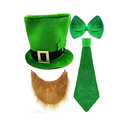 set di accessori per costume da folletto di San Patrizio da uomo, materiale in poliestere, cappello a cilindro verde con fibbia, barba finta, papillon e cravatta, feste e celebrazioni festive