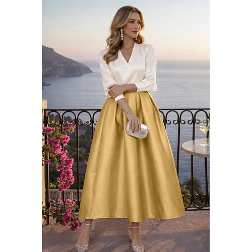 Due Pezzi Lunghezza Tè Abiti da Cocktail Abiti da festa Elegante Monocolore Manica Lunga Scollo a V Matrimonio Abbigliamento da Festa Raso con Pieghe