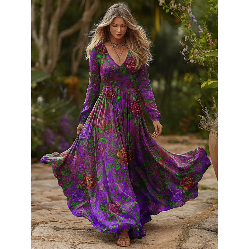 Women's Maxi Dress Pleated Dress Party Casual Boho Daily Date Going out Regular Fit Floral Graphic Long Sleeve V Neck Blue Fuchsia Spring Fall Winter