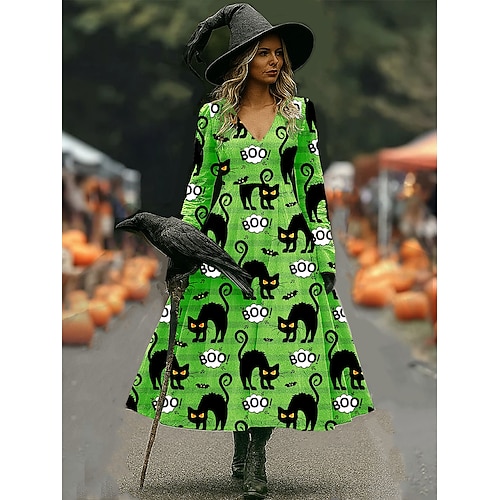 Abito midi Halloween da donna con stampa strega abito casual modello ad A vacanza abbigliamento casual matrimonio festa compleanno vestibilità regolare grafica maniche lunghe collo a V nero viola