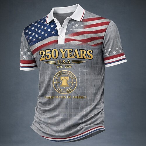 4. Juli 2026 250. Herren Amerikanische US-Flagge Poloshirts Kurzarm Polo-Shirts Revers Lässig Athleisure Alltagskleidung Festivalkleidung 3D-Druck Knöpfe Frühling Sommer Blau Rote Grau