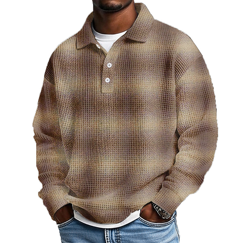 Men's Plaid Waffle Polo Shirts Long Sleeve Polo Shirts Lapel Casual School Athleisure Daily Wear 3D Print Spring Fall Light Brown Brown Gray