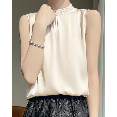 Damen Hemd Elegant Satin Bluse Einfach Aktiv Stilvoll Ärmellos Hoher Ausschnitt Normale Oberteile Täglich Ferien Ausgehen Gerafft Schwarz Weiß Champagner Rosa Pudriges Rosa Sommer Frühling