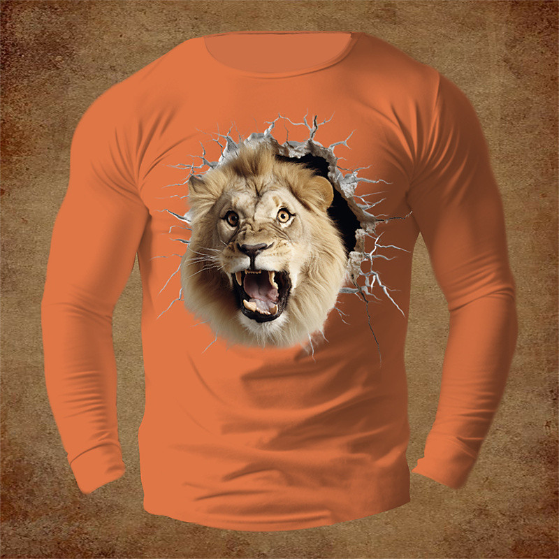Men's Long Sleeve T-Shirt with 3D Roaring Lion Graphic, Wild Animal Breakthrough Design Crew Neck Casual Top