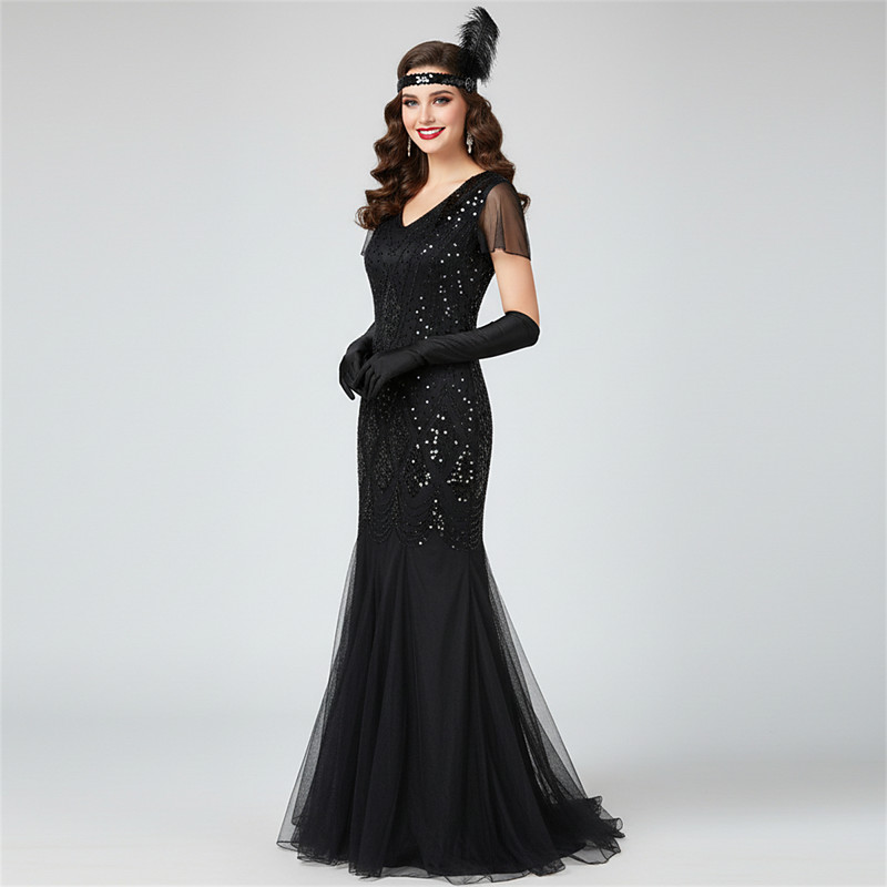 Set Retro Vintage Roaring 20s 1920s Floor Length Outfits Accessories Set Evening Dress with Accessories Short Sleeves The Great Gatsby Wedding Guest Sequins Sequin V Neck Fancy Dress Women's Carnival