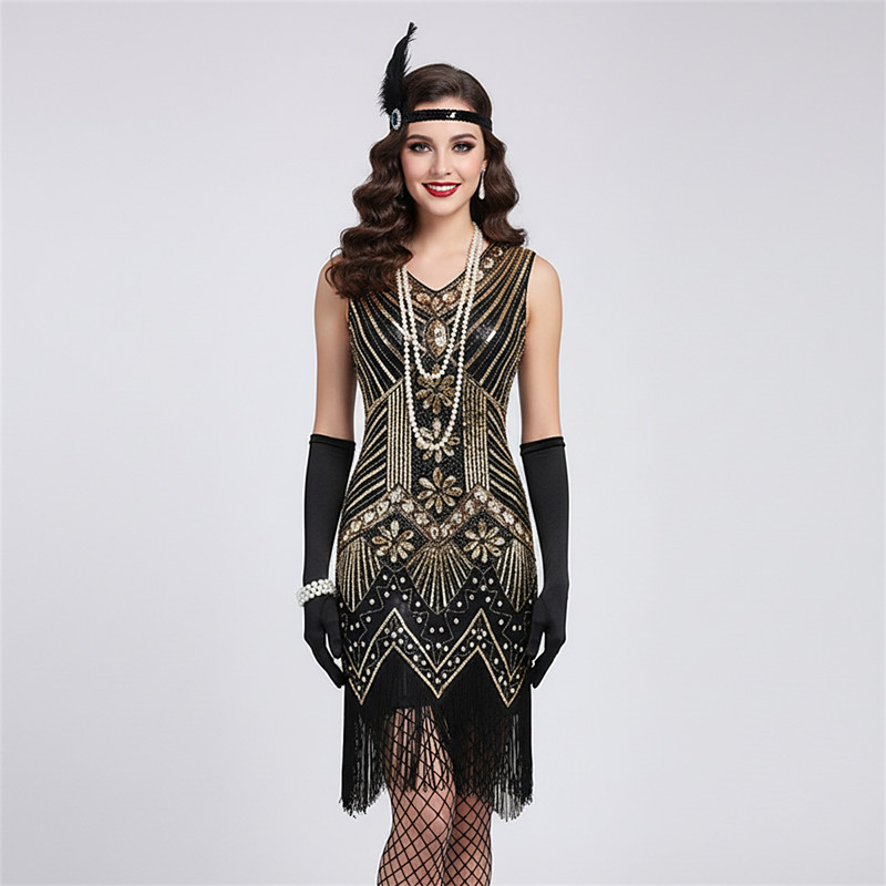 Set Roaring 20s Vintage Inspired The Great Gatsby Knee Length Short Length Flapper Dress Dress Outfits with Accessories Sleeveless The Great Gatsby Wedding Guest Sequins Tassel Fringe Sequin V Neck