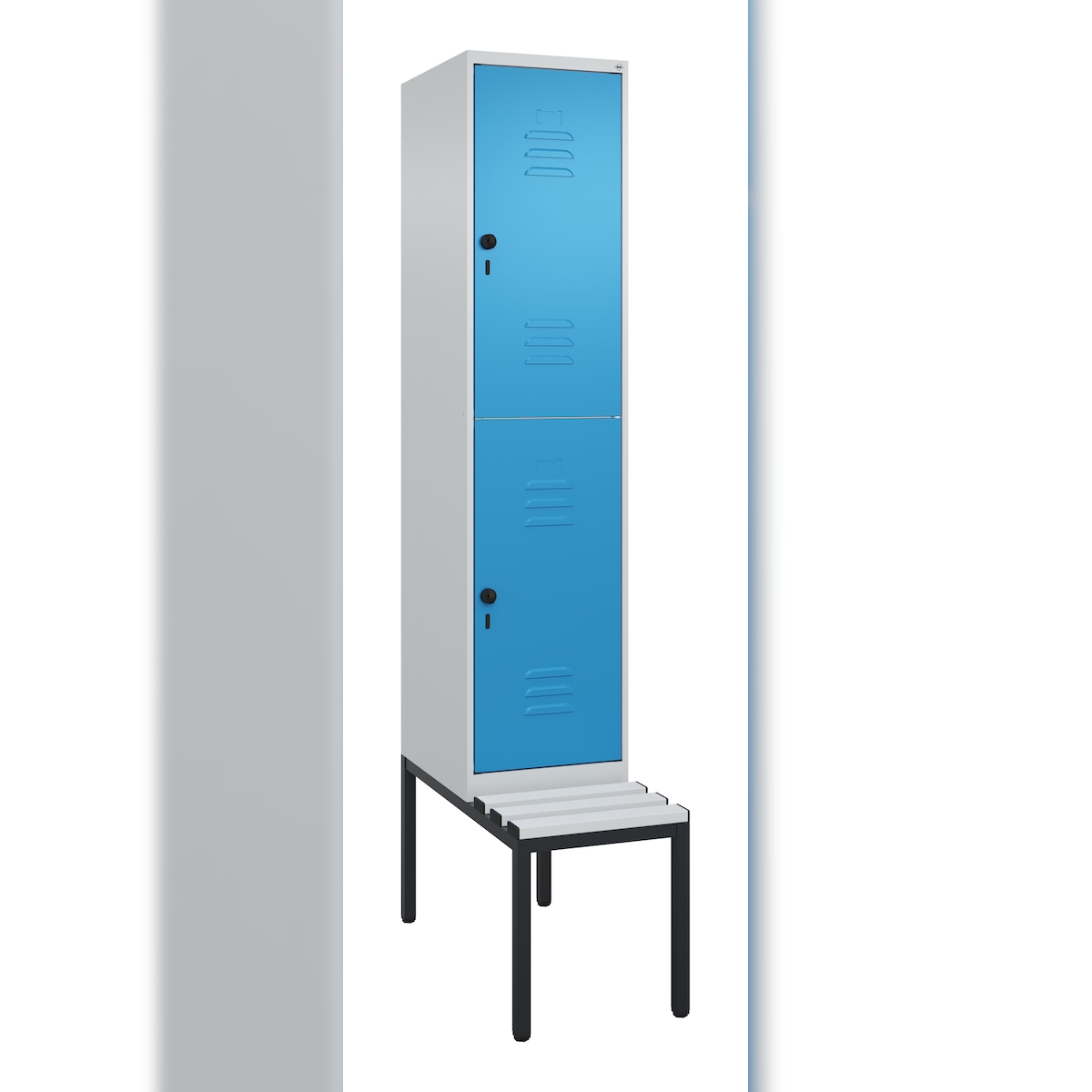 C+P Spind Classic PLUS, Kunststoff untergebaute Sitzbank, 2 Abteile, HxBxT 212x40x82cm, Sicherheitsdrehriegel, Hellgrau/Lichtblau von PROREGAL