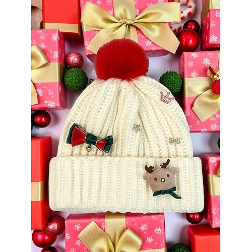 berretto da donna in maglia a tema natalizio con pompon, decorato con renne, fiocco e decorazioni scintillanti, disponibile in rosso e multicolore per le festività natalizie