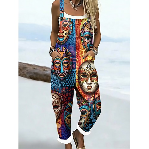 Per donna Tuta Attivo Grafico Senza Maniche Senza maniche Gamba larga Collo quadrato Tasca Stampato Quotidiano Vacanza Vestibilità comoda Blu marino Estate