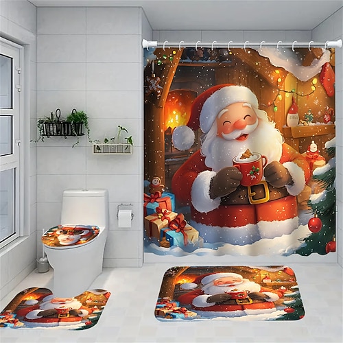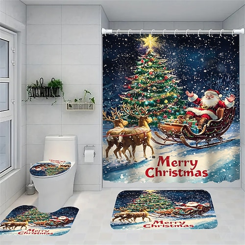 Tenda da doccia in quattro pezzi, con sedile del water antiscivolo e robusto e tappetino da bagno, motivo natalizio con Babbo Natale e albero di Natale, materiale in poliestere impermeabile con 12