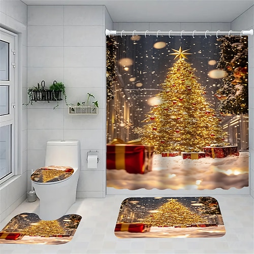 combinazione di tende da doccia in quattro pezzi, tra cui un robusto sedile del water antiscivolo e un tappetino da bagno – materiale in poliestere impermeabile con motivo ad albero di Natale e 12