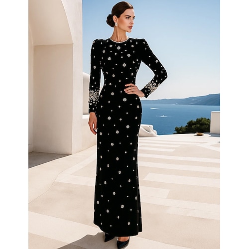 Abito da Prom Abito da Festa Floor Length Sheath Column Abiti Quinceanera Festa Elegante Maniche Lunghe Collo a Giro Sera Festa Matrimonio con Perline e Ricami