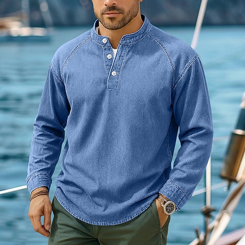 Per uomo Maglietta Maglia Henley Camicia 100% cotone lavaggio acido Manica Lunga Collo alla coreana Henley Estate Primavera Autunno Semplice Vintage Streetwear Casual Lavato Manica corta Casuale Casa