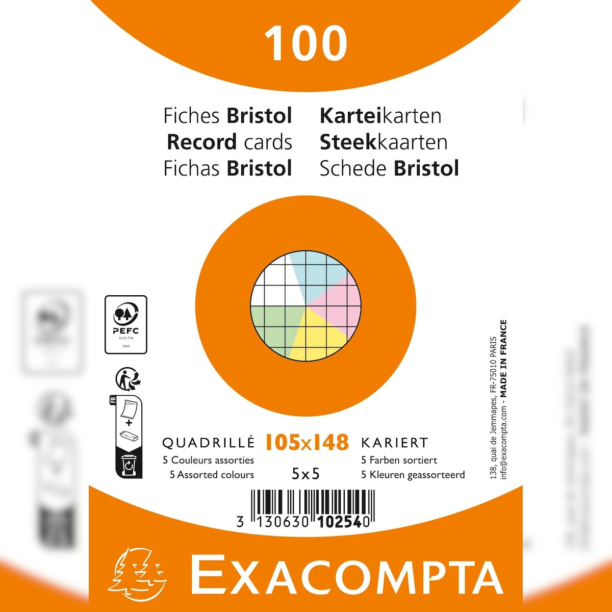 Exacompta 10254E 20x Karteikarten A6, Packung mit 100 Stück eingeschweißt, kariert, nicht gelocht, Farben sortiert - Farben sortiert