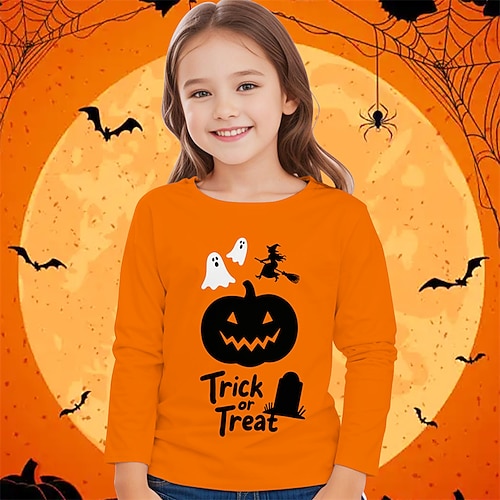 Halloween Mädchen 3D Kürbis Geist T-Shirt Langarm Frühling Herbst Mode Basic Kinder 4-12 Jahre Rundhalsausschnitt Outdoor Lässig Täglich Normale Passform