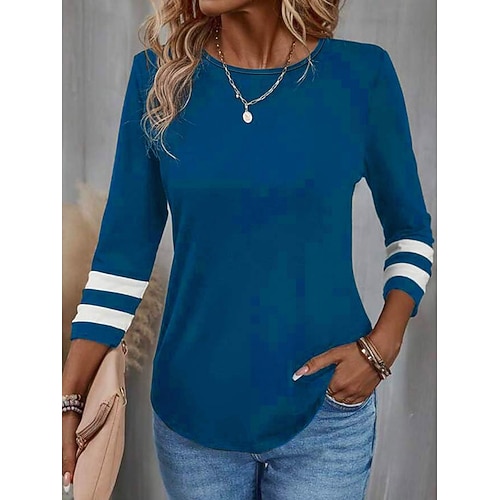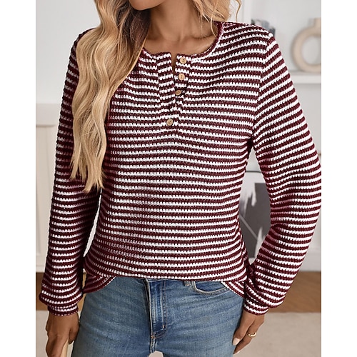 Per donna Maglietta A righe Classico Casual Manica Lunga Girocollo Top Regolari Quotidiano Uscire Bottoni Blu Nero Vino Marrone Bianco sporco Primavera Autunno