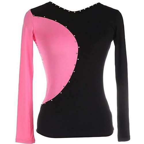 top da pattinaggio artistico nero elastico da allenamento, da competizione, termico, caldo, con cristalli/strass, manica lunga, pattinaggio artistico sul ghiaccio