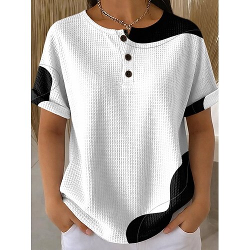 T-shirt waffle per donna stampa grafica a blocchi di colore geometrica vintage elegante classica manica corta collo rotondo top regolari quotidiani bianco e nero nero bianco giallo rosso estate
