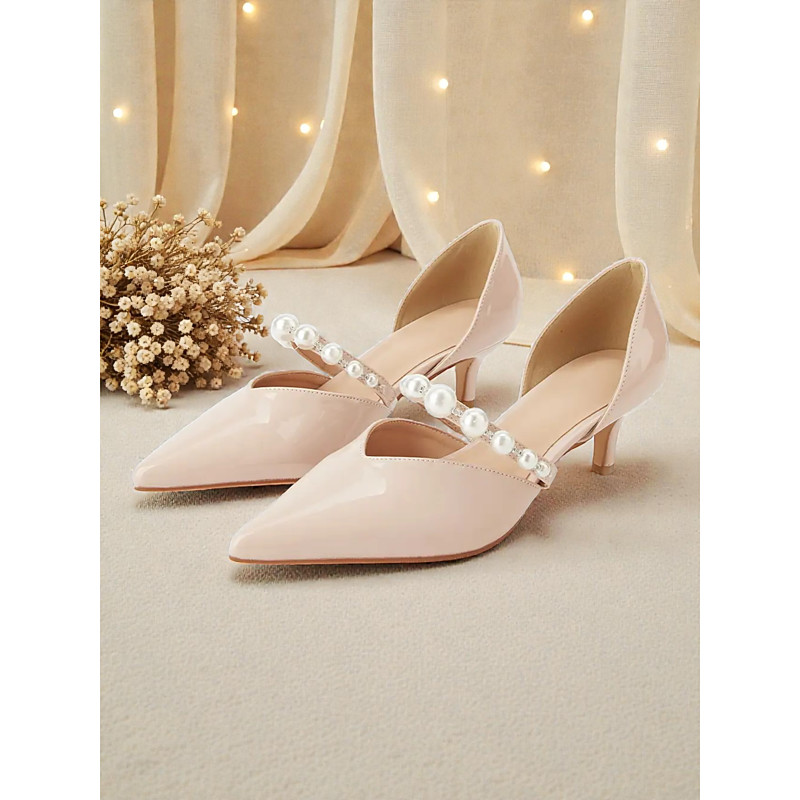 Women's Elegant Pearl Strap Low Heel Pumps - Patent Pointed Toe Dress Shoes for Mother of the Bride, City Chic Wedding Formal Ceremony