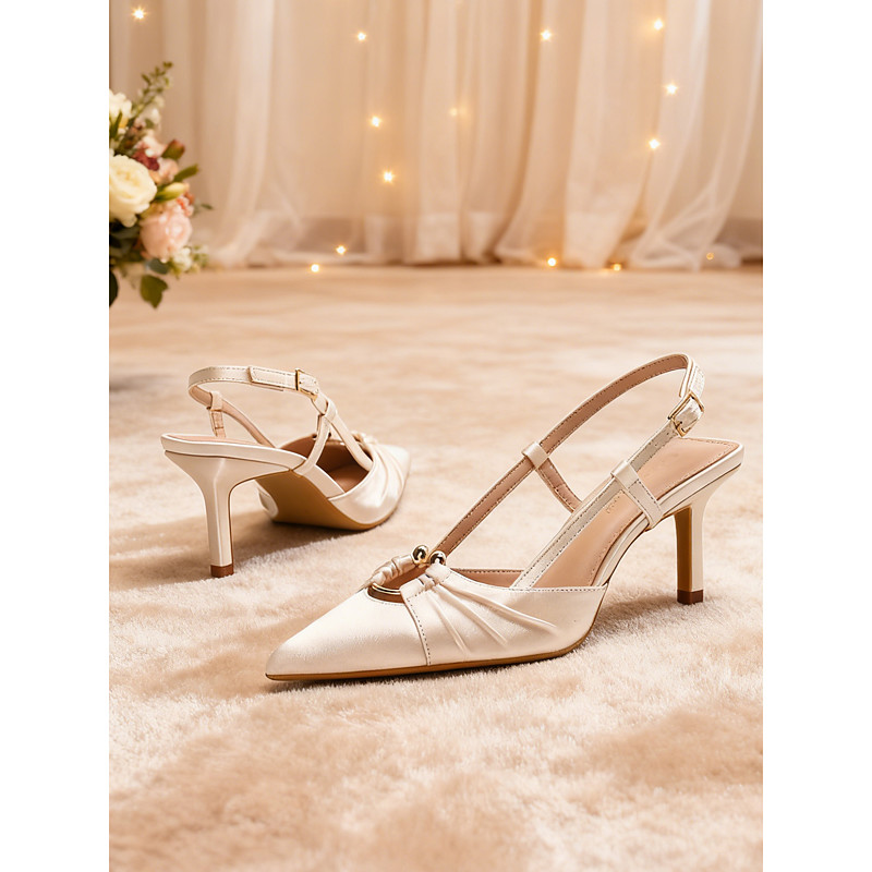 Women's Ivory Pointed-Toe Slingback Bridal Heels, Elegant Bow Detail Wedding Shoes for City Bride